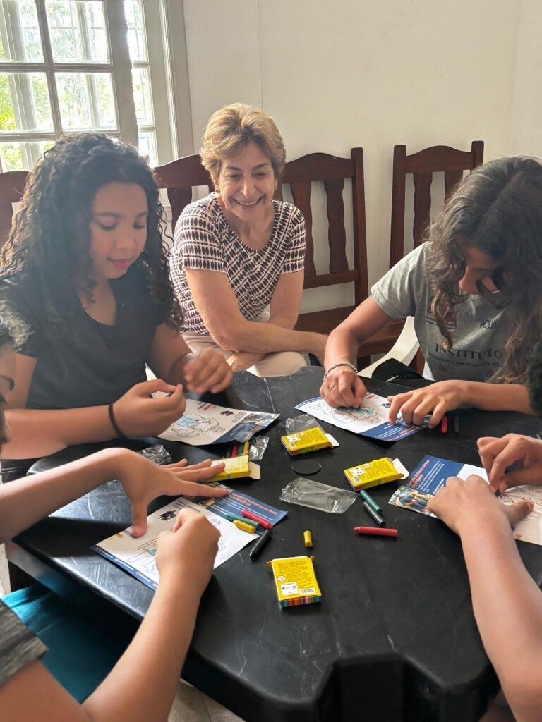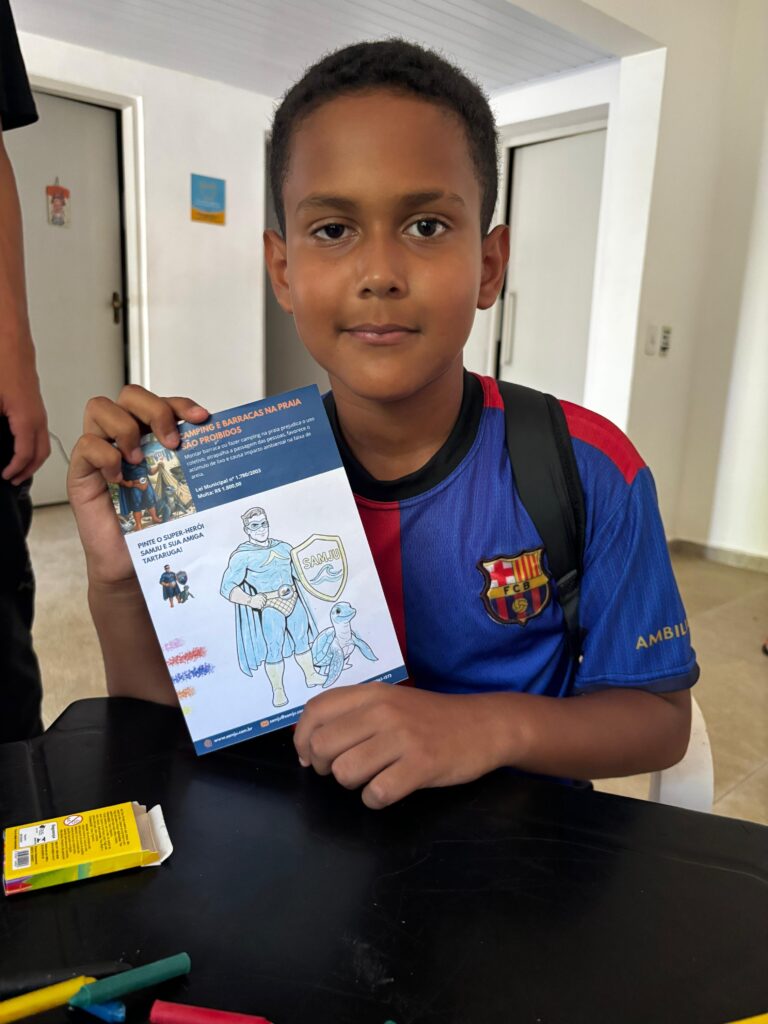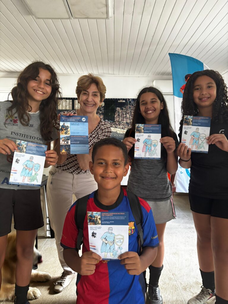 Realizamos encontros com as crianças para explicar as regras da praia de forma acessível, utilizando materiais educativos ilustrados, pintura do Super-Herói SAMJU e atividades interativas. Além disso, instalamos placas de orientação na praia, utilizando o personagem como elemento visual, justamente para despertar curiosidade, facilitar a leitura e reforçar as mensagens de forma amigável.